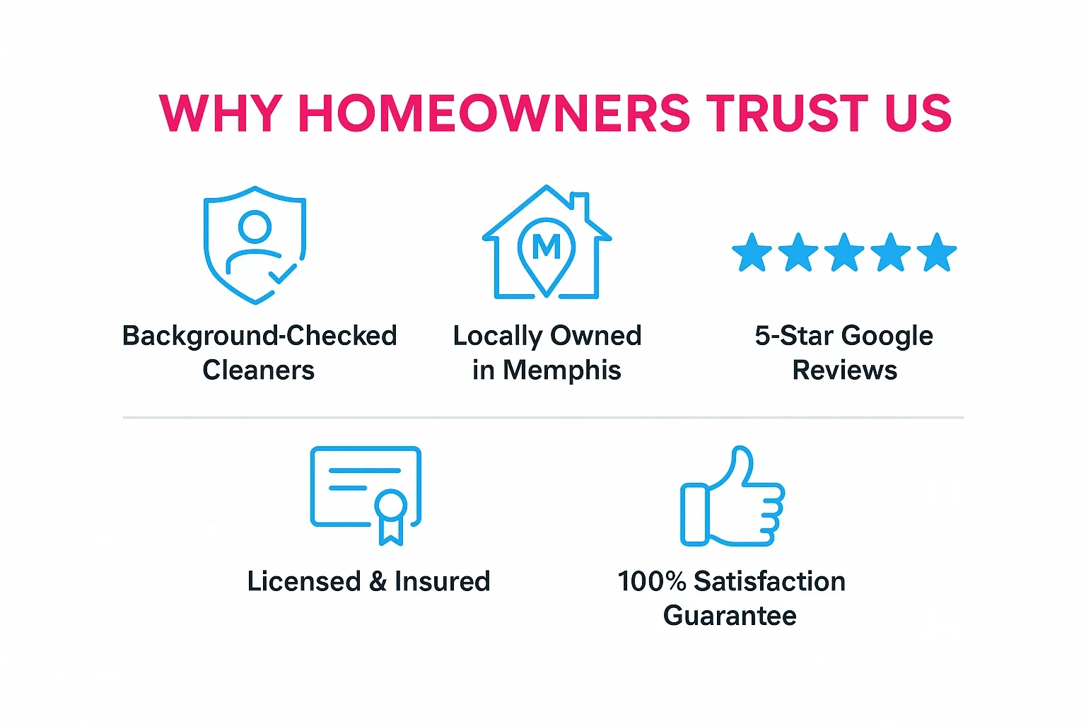 We take pride in being a locally owned Memphis cleaning company with many 5-star Google reviews and a 100% satisfaction guarantee. From spotless kitchens to sparkling bathrooms, every service is delivered with care, consistency, and attention to detail. When you choose Kiss Cleaning, you’re choosing reliability, transparency, and a home that feels brand new every time.